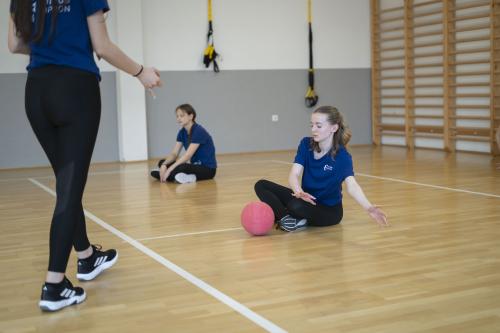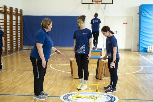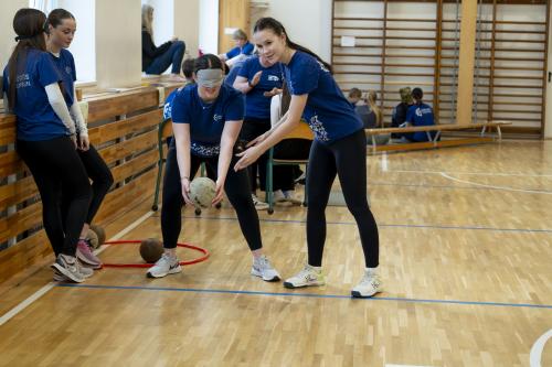 A felső tornateremben a diákok megismerkedhettek a csörgőlabda alapjaival, és ki is próbálták a játékot. A speciális, hangot adó labdákat pályázati forrásból sikerült beszereznünk.